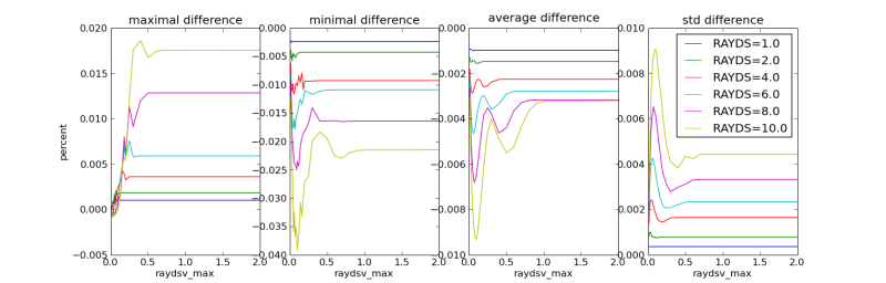 However, reducing rayds_vmax increases the maximal difference of rays pointing upwards. Further, there seems to be a combination of rayds/raydsv_max which is „optimally“ bad, as there is a local maximum/minimum in the maximal/minimal difference at about the same location.